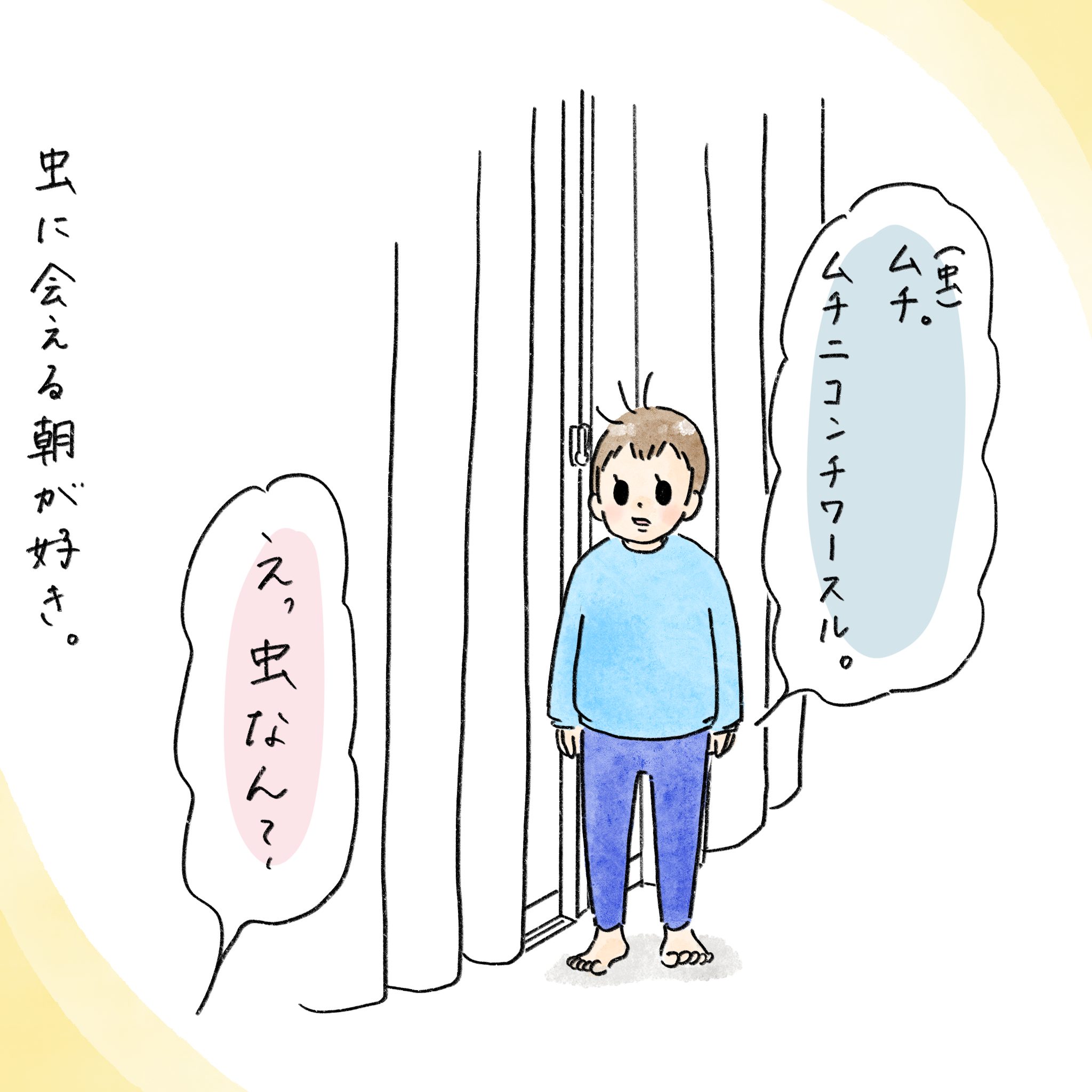 虫に話しかけてるなぁとは思ってたけど、そんなに好きやったのは知らなかったよ。電車とか車ばっかり好きやったけど、虫博士にもなれるかな?