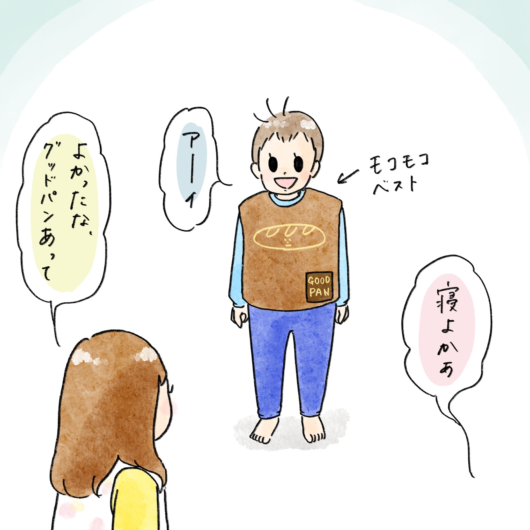 パンの絵と、グッドパンって書いてある私がお気に入りなモコモコベスト。