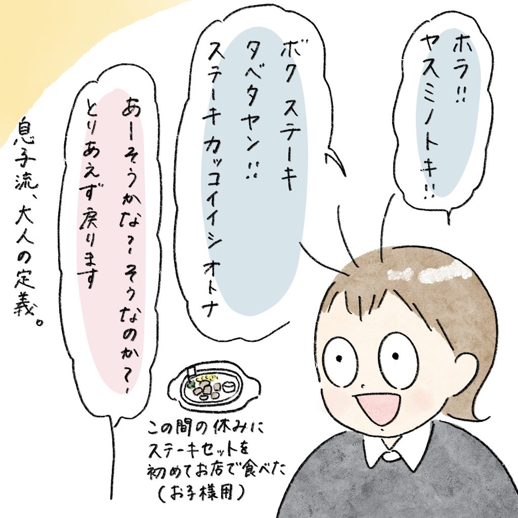 初めて食べたお子様ステーキセットをすごく気に入っていた息子。大人になった気分だったのか。